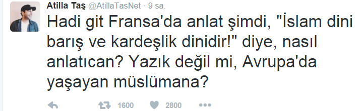 Sanat piyasasında dibe vurduktan sonra sosyal medyada siyasi paylaşımlar yaparak gündeme gelmeye çalışan ve geçtiğimiz günlerde CHP'ye üye olan Gezi destekçisi çapulcu Atilla Taş, Fransa'da onlarca kişinin öldüğü saldırı sonrası skandal açıklamada bulundu. Sol kırması sözde aydınlara yaptığı şirinlik gösterisi ile bilinen Atilla Taş, olay sonrası attığı tweette ''Hadi git Fransa'da anlat şimdi, "İslam dini barış ve kardeşlik dinidir!" diye, nasıl anlatıcan? Yazık değil mi, Avrupa'da yaşayan müslümana?'' diyerek İslam dini ile şiddeti yan yana göstermeye çalışarak haddini aştı.