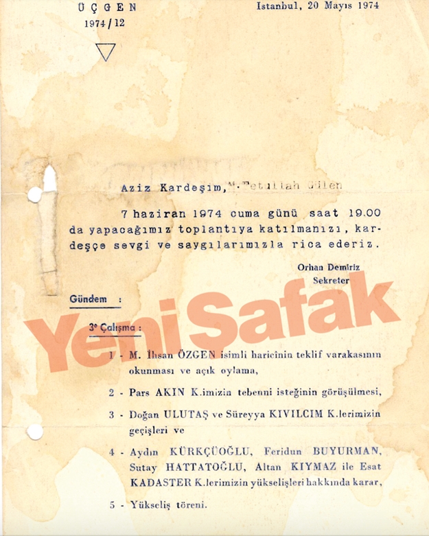 21 Nisan 1974 tarihli ‘Orhan Demiriz/Sekreter’ imzalı davetiyede, “Aziz Kardeşim, M. Fetullah Gülen. 10 Mayıs 1974 Cuma günü saat 19.00′da yapacağımız toplantıya katılmanızı, kardeşçe sevgi ve saygılarımla rica ederim” deniliyor.