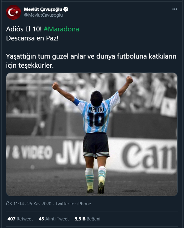 Dışişleri Bakanı Mevlüt Çavuşoğlu, Twitter hesabından İspanyolca olarak, "Güle güle 10 Numara. Huzur içinde yat." ifadelerini kullanarak Maradona hakkında taziye mesajı paylaştı.