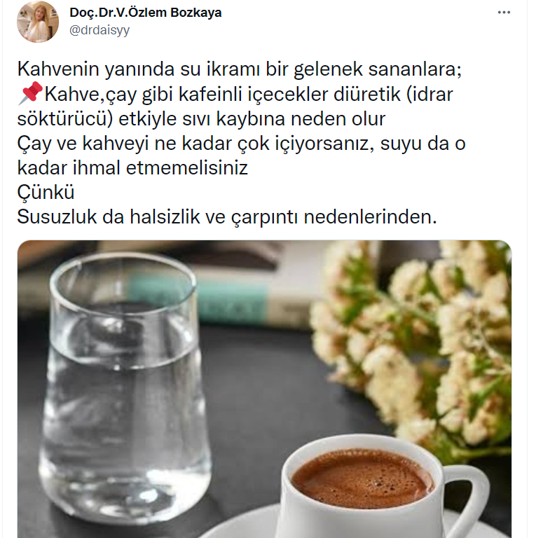 Özlem Bozkaya, sosyal medya hesabından yaptığı paylaşımda, "Kahvenin yanında su ikramı bir gelenek sananlara; kahve, çay gibi kafeinli içecekler diüretik (idrar söktürücü) etkiyle sıvı kaybına neden olur. Çay ve kahveyi ne kadar çok içiyorsanız, suyu da o kadar ihmal etmemelisiniz. Çünkü susuzluk da halsizlik ve çarpıntı nedenlerinden" dedi.