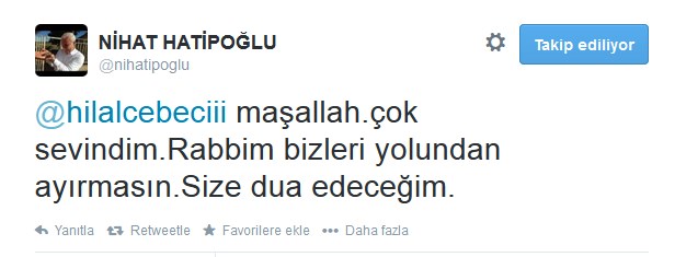 Daha önce de Umre'ye gitmek istedi ğini söyleyen Hilal Cebeci'nin bu tweetine Hatipoğlu da cevap verdi. Nihat Hatipoğlu, Cebeci’ye "Maşallah çok sevindim. Rabbim sizleri yolundan ayırmasın. Size dua edeceğim" diye yazdı.