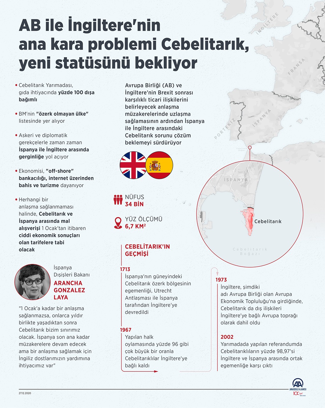 Brexit'in resmi olarak yürürlüğe gireceği 1 Ocak 2021'den itibaren Avrupa Birliği'nin (AB) güney sınırı olacak Cebelitarık ile ilgili bazı konularda İspanya, İngiltere ve Cebelitarık özerk yönetimi uzlaşma sağlasa da malların ve kişilerin serbest dolaşımı başta olmak üzere çözüm bekleyen birçok konuda görüşmeler devam ediyor.Yaklaşık 34 bin kişinin yaşadığı, 6,7 kilometrekarelik yüzölçümüne sahip Cebelitarık Yarımadası, gıda ihtiyacında yüzde 100 dışa bağımlı bulunuyor.