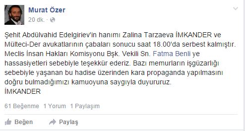 İMKANDER genel başkanı Murat ÖZER, sosyal paylaşım siesi Facebook sayfasından yaptığı açıklamada, Zalina Tarzaeva'nın serbest bırakıldığını duyurdu.
