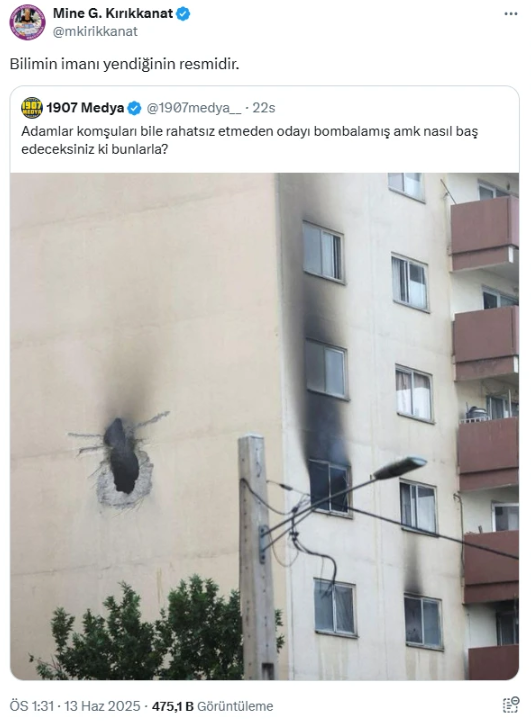 Laikçi seküler mahallenin cehalet konusunda bayrağını sallayan Cumhuriyet'in yazar eskisi Mine Kırıkkanat, İranlı komutanın vurulan yatak odasını paylaşarak İslam'ı hedef aldı.