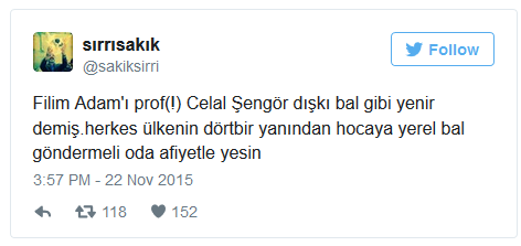 "Filim Adam'ı prof(!) Celal Şengör dışkı bal gibi yenir demiş.herkes ülkenin dörtbir yanından hocaya yerel bal göndermeli oda afiyetle yesin"