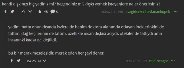 Celal Şengör, bir Ekşi Sözlük kullanıcısının "Kendi dışkınızı yediniz mi? Beğendiniz mi? Dışkı yemek isteyenlere neler önerirsiniz?" sorusuna cevap vererek, "Yedim. Hatta onun dışında İsviçre'de benim doktora alanımda otlayan ineklerinkini de tattım. Dağ keçilerinin de tattım. Özellikle insan dışkısı acıydı. Ötekiler de tatlıydı ama insanınki kadar acı değildi. Bu bir merak meselesidir, merak eden her şeyi dener." cevabını verdi.