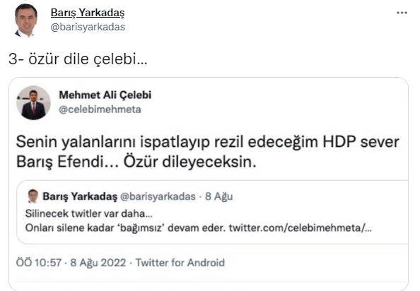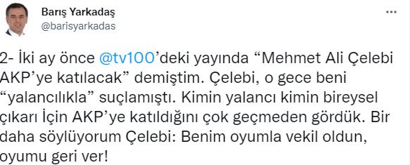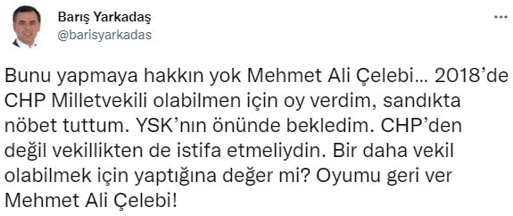 “Bunu yapmaya hakkın yok Mehmet Ali Çelebi” diyen Yarkadaş paylaşımında, “2018’de CHP Milletvekili olabilmen için oy verdim, sandıkta nöbet tuttum. YSK’nın önünde bekledim. CHP’den değil vekillikten de istifa etmeliydin. Bir daha vekil olabilmek için yaptığına değer mi? Oyumu geri ver Mehmet Ali Çelebi! İki ay önce tv100’deki yayında “Mehmet Ali Çelebi AKP’ye katılacak” demiştim. Çelebi, o gece beni “yalancılıkla” suçlamıştı. Kimin yalancı kimin bireysel çıkarı İçin AKP’ye katıldığını çok geçmeden gördük. Bir daha söylüyorum Çelebi: Benim oyumla vekil oldun, oyumu geri ver! Özür dile Çelebi. Oyumu geri ver Mehmet Ali Çelebi” dedi.