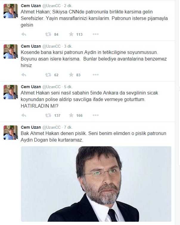Sosyal paylaşım ağı twitter'da, @UzanCC ismiyle paylaşımlarda bulunan kaçak işadamı Cem Uzan, Hürriyet yazarı Ahmet Hakan'a ağır hakaretlerde bulundu.