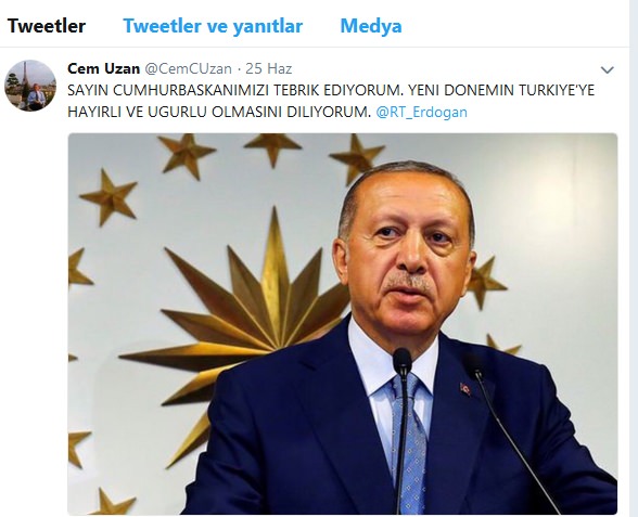 Fransa'da yaşayan iş adamı ve Genç Parti Genel Başkanı Cem Uzan , sosyal medya üzerinden yaptığı paylaşımla, 24 Haziran seçimlerini kazanan Cumhurbaşkanı Tayyip Erdoğan’ı tebrik etti.