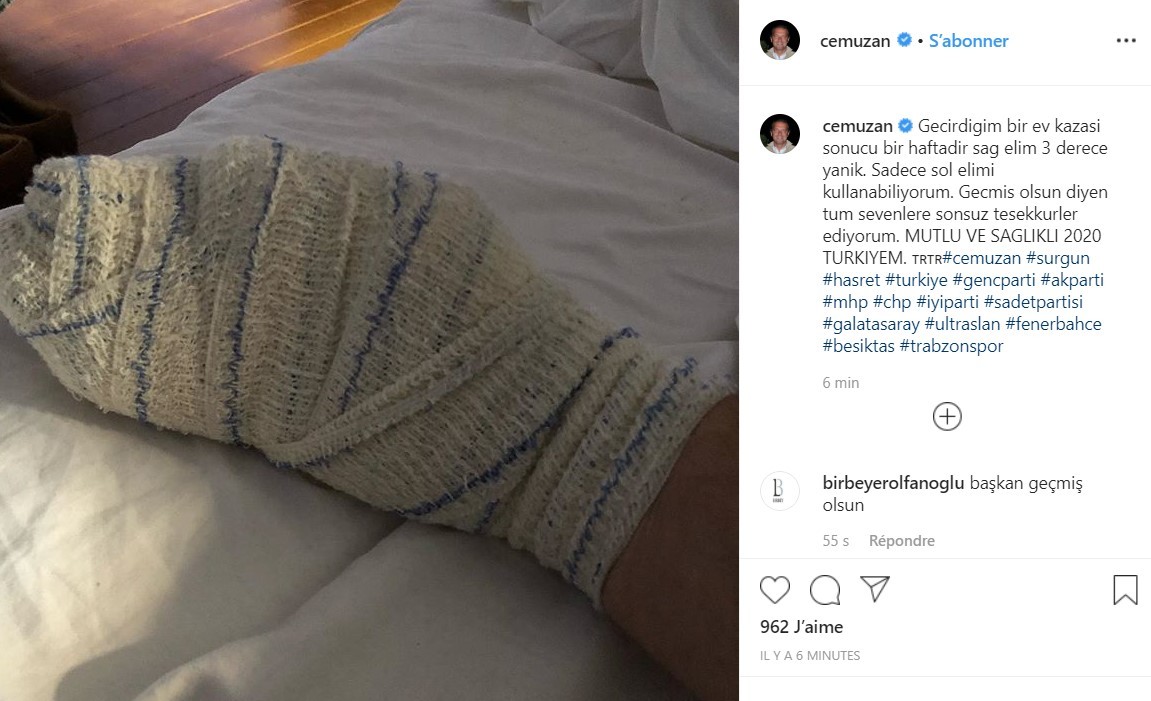 Şahsi Instagram hesabından açıklamada bulunan Cem Uzan, evinde geçirdiği bir kaza sonucunda sağ elini kullanamadığını ifade etti. Bir haftadır sağ elinin sargıda olduğunu söyleyen Uzan, elinde üçüncü derece yanık oluştuğunu belirtti.