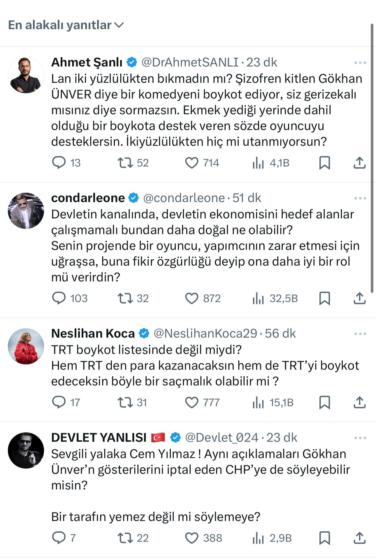TRT'nin dizisinde oynayan Aybüke Pusat'ın Özgür Özel'in boykot kararına destek vermesi ve sonrasında ise kovulması sonrası ahlaksız filmleriyle tanınan oyuncu Cem Yılmaz oyuncu Pusat'a destek vermişti. Yılmaz'a sosyal medyadan kullanıcılar büyük tepki gösterdi.