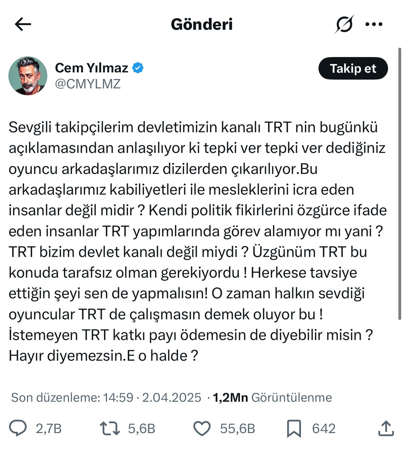 TRT bizim devlet kanalı değil miydi? Üzgünüm TRT bu konuda tarafsız olman gerekiyordu ! Herkese tavsiye ettiğin şeyi sen de yapmalısın! O zaman halkın sevdiği oyuncular TRT de çalışmasın demek oluyor bu ! İstemeyen TRT katkı payı ödemesin de diyebilir misin ? Hayır diyemezsin. E halde?' ifadelerine yer verdi.