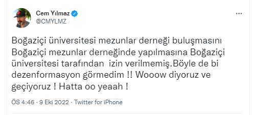 "Boğaziçi üniversitesi mezunlar derneği buluşmasını Boğaziçi mezunlar derneğinde yapılmasına Boğaziçi üniversitesi tarafından izin verilmemiş." diyen Yılmaz, sözlerinin devamında kendince mizah yaparak şu ifadeleri kullandı: