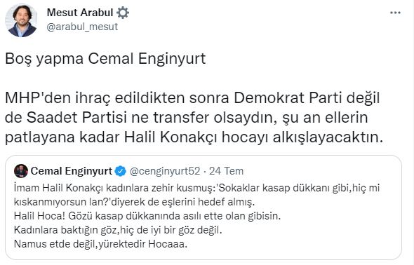 Arabul Enginyurt’un paylaşımını retweetleyerek, “Boş yapma Cemal Enginyurt MHP'den ihraç edildikten sonra Demokrat Parti değil de Saadet Partisi ne transfer olsaydın, şu an ellerin patlayana kadar Halil Konakçı hocayı alkışlayacaktın” ifadelerini kullandı.