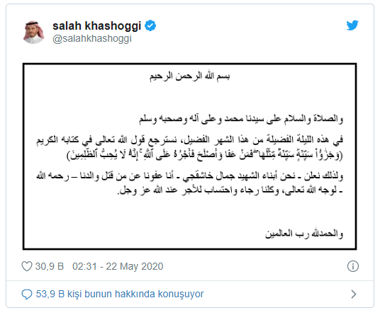 Cemal Kaşıkçı'nın oğlu Salah Kaşıkçı, resmi Twitter hesabından yaptığı paylaşımla babasının katillerini affettiklerini söyledi.