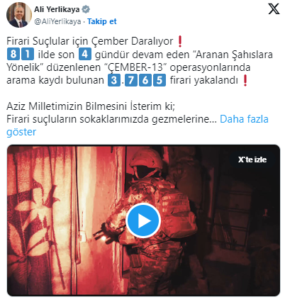 İçişleri Bakanı Ali Yerlikaya sosyal medya hesabı üzerinden "Çember-13" operasyonları çerçevesinde 3 bin 765 firarinin yakalandığını bildirdi.