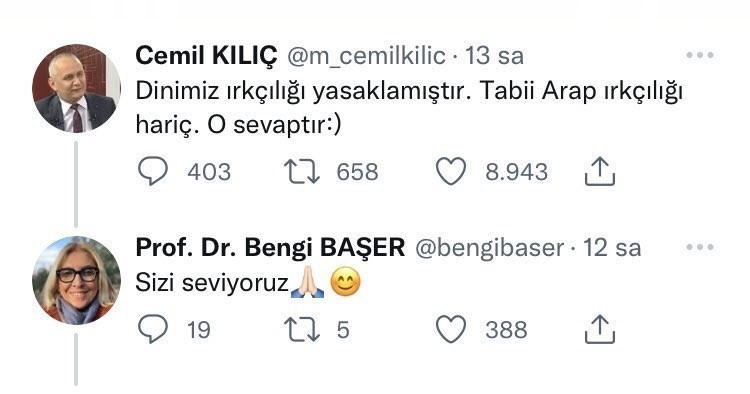Yüce dinimiz İslam'ın kesin bir şekilde yasakladığı ırkçılığı teşvik eden Kılıç, "Dinimiz ırkçılığı yasaklamıştır. Tabi Arap ırkçılığı hariç. O sevaptır." diyerek mesajına gülme ikonu ekledi.
