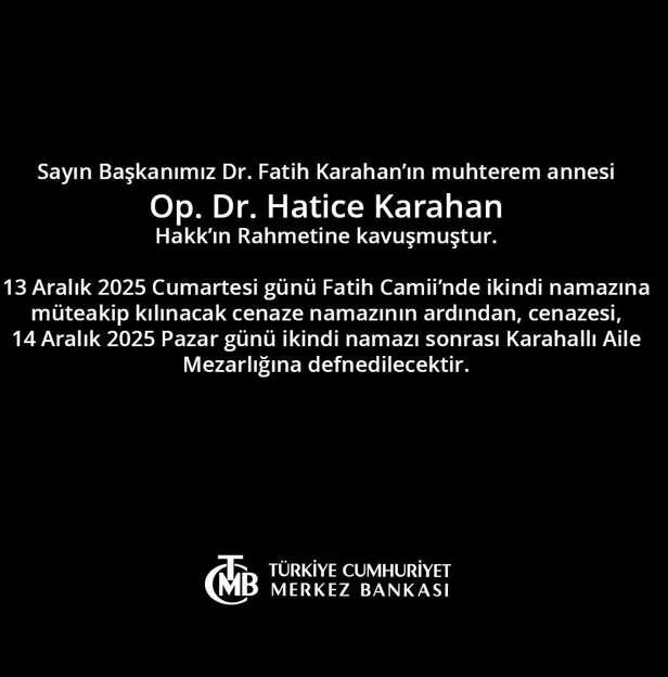 Türkiye Cumhuriyet Merkez Bankası (TCMB) Başkanı Fatih Karahan'ın annesi Opr. Dr. Hatice Karahan, yaşamını yitirdi.