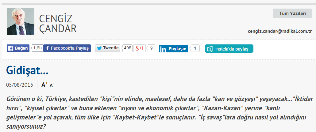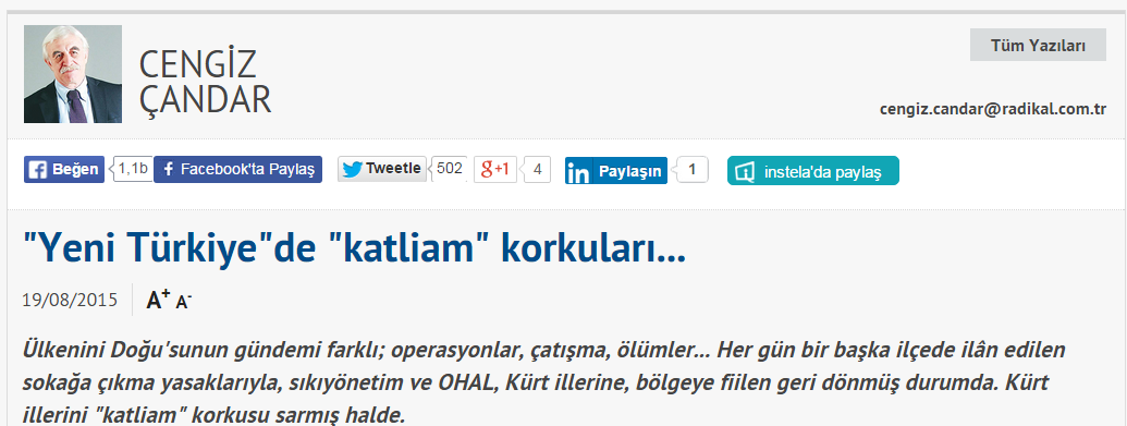Radikal Gazetesi’nde kalem oynatan, gazete kapanınca internet sitesinden yazıları yayınlanan Cengiz Çandar, patronunu kızdırdı.. Yazıları; Radikal'in internet sitesi ile eşzamanlı olarak Hürriyet’in internet sitesinden de yayınlanan Çengiz Çandar, patronu Aydın Doğan’ı kızdırınca, iki haftada üç yazısına ambargo konuldu.. 60'a yakın şehidimizin olduğu bu günlerde bile, hala terör örgütü lehine yazılar kaleme alan Çandar’ın PKK’yı savunan yazılarının Hürriyet’in internet sitesine konulmaması dikkat çekti. Terör örgütlerine verdiği destek ile bilinen Doğan Medyasını bile kızdıracak boyutlara varan yazılar kaleme alan Çandar'ın son yazılarının Hürriyet'in internet sitesine konulmaması, yazarın Radikal'de de artık yazamayacağı yorumlarına sebeb oldu.