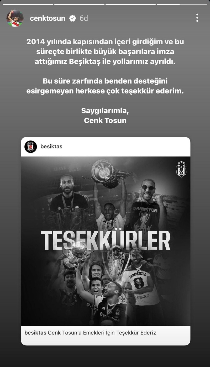 Fenerbahçe'nin yeni transferi Cenk Tosun, eski kulübü Beşiktaş için bir veda paylaşımında bulundu.