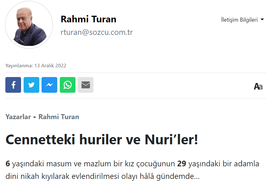 "Cennet genelev mi?" yazısını imzasız yayınlayan Rahmi Turan, Hiranur Vakfı kurucusu Yusuf Ziya Gümüşel'e atılan "kızını 6 yaşında evlendirdi" iftirasından sonra "Cennetteki huriler ve nuriler" başlığı ile ahlak dışı bir yazı kaleme aldı.