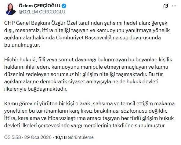 CHP’den istifa ederek AK PARTİ saflarına katılan AYDIN Büyükşehir Belediye Başkanı Özlem ÇERÇİOĞLU, kendisini hedef alan CHP Genel Başkanı ÖZGÜR ÖZEL hakkında suç duyurusunda bulundu. ÇERÇİOĞLU, ÖZEL’in açıklamalarını "manipülasyon ve itibar suikastı" olarak niteledi.