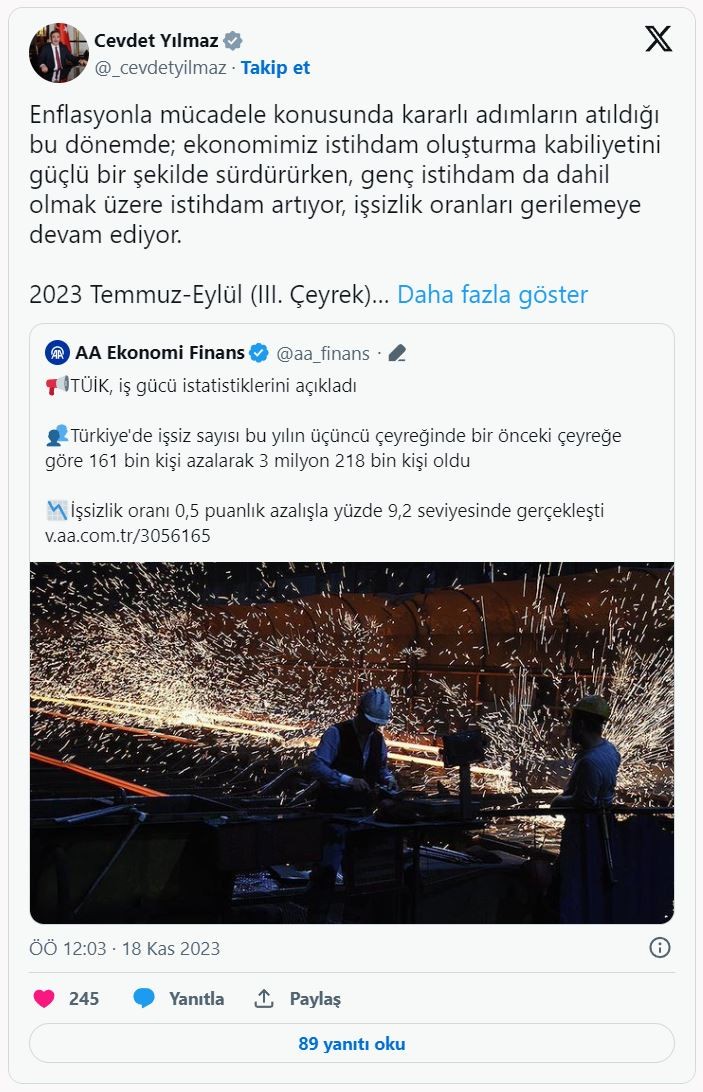 Yılmaz paylaşımında, "Enflasyonla mücadele konusunda kararlı adımların atıldığı bu dönemde; ekonomimiz istihdam oluşturma kabiliyetini güçlü bir şekilde sürdürürken, Genç istihdam da dahil olmak üzere istihdam artıyor, oran oranları gerilemeye devam ediyor.