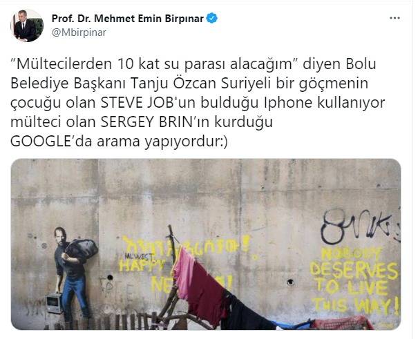 Çevre ve Şehircilik Bakan Yardımcısı Birpınar, sosyal medya hesabı üzerinden yaptığı açıklamada, “‘Mültecilerden 10 kat su parası alacağım’ diyen Bolu Belediye Başkanı Tanju Özcan Suriyeli bir göçmenin çocuğu olan Steve Job’un bulduğu İphone kullanıyor, mülteci olan Sergey Brin’in kurduğu Google’da arama yapıyordur” ifadelerini kullandı.