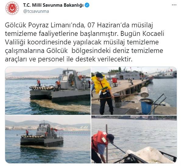 MSB’nın sosyal medya hesabından yapılan paylaşımda, “Gölcük Poyraz Limanı’nda, 07 Haziran’da müsilaj temizleme faaliyetlerine başlanmıştır. Bugün Kocaeli Valiliği koordinesinde yapılacak müsilaj temizleme çalışmalarına Gölcük bölgesindeki deniz temizleme araçları ve personel ile destek verilecektir” ifadeleri kullanıldı.