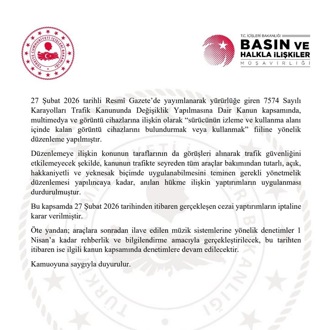 Bakanlıktan yapılan açıklamada, 27 Şubat 2026 tarihinde Resmi Gazete'de yayımlanarak yürürlüğe giren 7574 Sayılı Karayolları Trafik Kanunu'nda Değişiklik Yapılmasına Dair Kanun kapsamında, multimedya ve görüntü cihazlarına ilişkin olarak "sürücünün izleme ve kullanma alanı içinde kalan görüntü cihazlarını bulundurmak veya kullanmak" fiiline yönelik düzenleme yapıldığı hatırlatıldı.