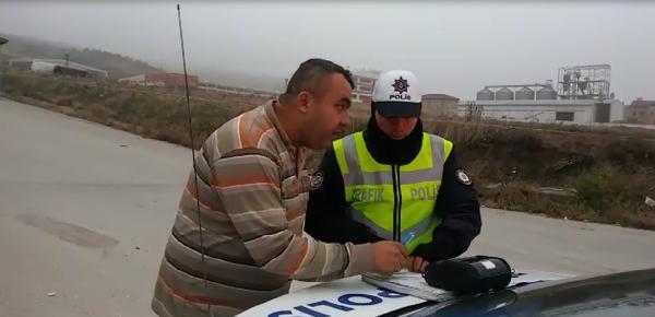 Çorum'da, kış lastiği denetiminde durdurulan kamyon sürücüsü Mehmet Ç., kendisine ceza yazan trafik polislerine tepki gösterdi. Cezanın tek kendisine kesildiğini öne sürüp öfkelenen sürücü, uygulamada diğer birçok araca kesilen ceza makbuzlarının kendisine gösterilmesi üzerine polislerden özür dileyerek teşekkür etti.