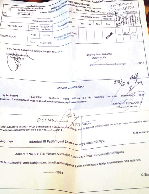 Sincan Cezaevi Müdürlüğü tarafından Alan’a gönderilen tebligatta Alan’dan 850 TL ödeme yapması istenirken Engin Alan’ın kızı Tülin Alan gelen tebligatı twitter hesabından paylaştı.