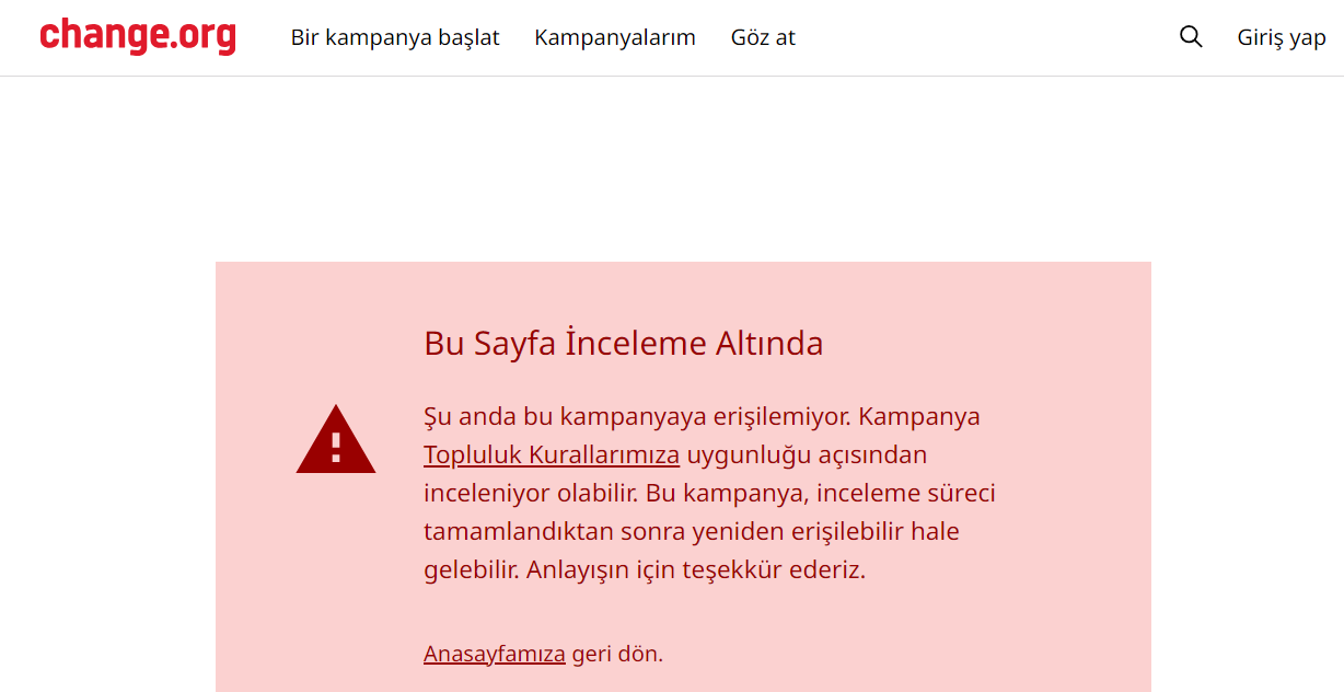 Change.org kampanyaya ulaşan linke erişim engeli getirdi.
