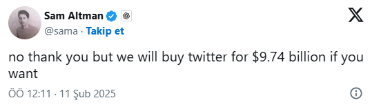 97 milyar dolarlık teklif; OpenAI'ın kurucusu Sam Altman tarafından "İstersen biz 9.7 milyar dolara Twitter'ı (X) satın alabiliriz." sözleriyle reddedildi.