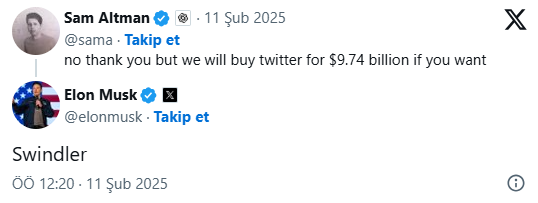 Reddedilen Musk ise Sam Altman'a "Dolandırıcı" diyerek karşılık verdi.