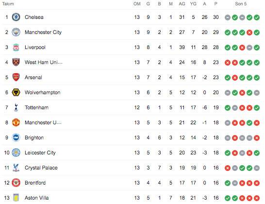 Yüzde 65,7 topa sahip olma oranıyla oynayan Chelsea'nin kaptanı Jorginho, 69. dakikada penaltıdan attığı golle skoru belirledi. Liderliğini sürdüren Chelsea, puanını 30'a, Manchester United ise 18'e çıkardı. Böylece Chelsea ile en yakın takipçisi Manchester City arasındaki fark bir puana düştü.