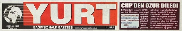 FETÖ'nün yayın organlarından Sızıntı Dergisi ve Zaman Gazetesi'nde yazarlık yapan Bahri Şenkal, CHP'den özür dileyen bir yazı yazdı. FETÖ'cü isme adeta sahip çıkan CHP'nin bülteni Yurt Gazetesi, Şenkal'in yazısını birinci sayfadan yayınladı.