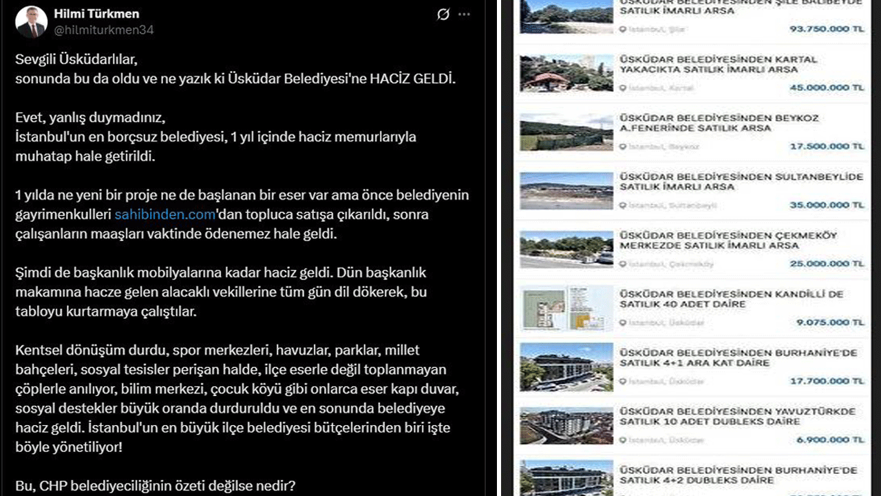 Türkmen, “Üsküdar Belediyesi’ne haciz geldi” ifadeleriyle başladığı açıklamasında, göreve geldikten sonra yeni hiçbir projeye imza atmayan mevcut yönetimin, belediyenin gayrimenkullerini topluca satışa çıkardığını, çalışan maaşlarının ise artık zamanında ödenemediğini belirtti. Skandalın son perdesi ise haciz memurlarının belediyeye gelmesiyle yaşandı.