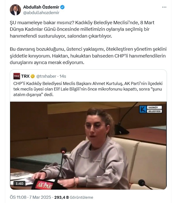AK Parti İstanbul İl Başkanı Abdullah Özdemir ise skandal olay ile ilgili sosyal medya hesabından açıklama yaparak, "Şu muameleye bakar mısınız? Kadıköy Belediye Meclisi'nde, 8 Mart Dünya Kadınlar Günü öncesinde milletimizin oylarıyla seçilmiş bir hanımefendi susturuluyor, salondan çıkartılıyor. Bu davranış bozukluğunu, üstenci yaklaşımı, ötekileştiren yönetim şeklini şiddetle kınıyorum. Haktan, hukuktan bahseden CHP'li hanımefendilerin duruşlarını ayrıca merak ediyorum." ifadelerini kullandı.