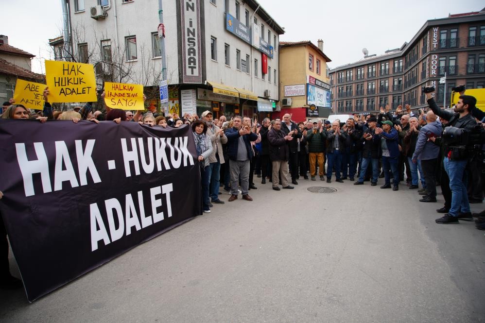 Şükrü Ciravoğlu için eylem yapan CHP'liler, "hak, hukuk, adalet" yazılı pankart açtı.