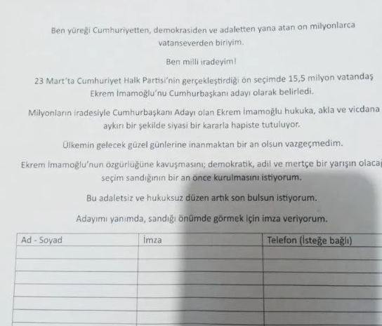 Söz konusu skandal belgede, "Ben, yüreği Cumhuriyetten, Demokrasiden ve adaletten yana atan on milyonlarca vatanseverden biriyim. Ben Mili iradeyim. 23 Mart'ta gerçekleştirilen seçimlerde, 15,5 Milyon vatandaş, Ekrem İmamoğlu'nu Cumhurbaşkanı adayı olarak belirledi. Milyonların iradesiyle Cumhurbaşkanı adayı belirlenen Ekrem İmamoğlu, Hukuka, akla ve vicdana aykırı bir şekilde siyasi bir kararla hapiste tutuluyor. Ülkemin gelecek güzel günlerine inanmaktan asla vazgeçmedim. Ekrem İmamoğlu'nun özgürlüğüne kavuşmasını, demokratik, adil ve mertçe bir yarışın olacağı seçim sandığının bir an önce kurulmasını istiyorum. Bu adaletsiz düzen son bulsun istiyorum. Adayımı yanımda, sandığı önümde görmek için imza veriyorum" ifadeleri yer aldı.