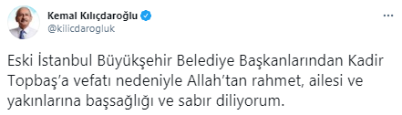 CHP Genel Başkanı Kemal Kılıçdaroğlu da yayımladığı taziye mesajında, "Eski İstanbul Büyükşehir Belediye Başkanlarından Kadir Topbaş’a vefatı nedeniyle Allah’tan rahmet, ailesi ve yakınlarına başsağlığı ve sabır diliyorum." ifadelerini kullandı.