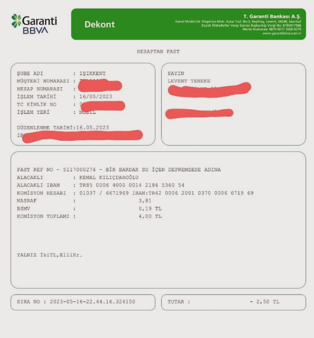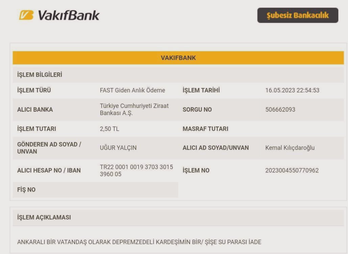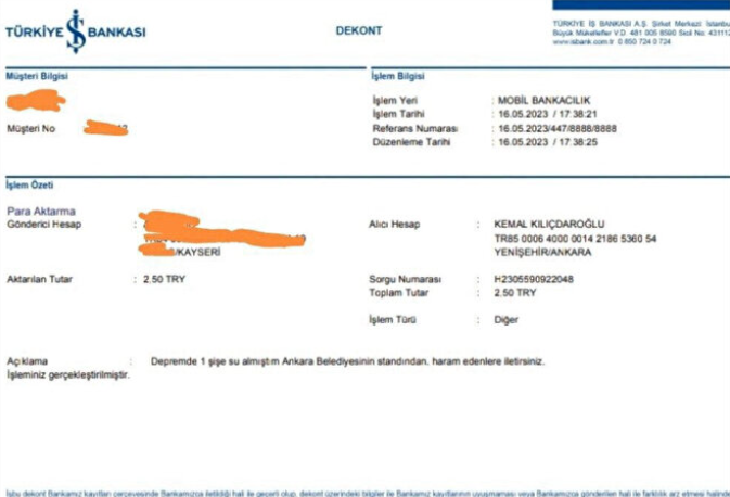CHP’lilerin hakaretlerine maruz kalan bir depremzede de Ankara Büyükşehir Belediyesi'nin tuvaletlerini kullandığı için, para gönderdi. Kemal Kılıçdaroğlu'na gönderdiği 5 liranın dekontunu paylaşan depremzede paylaştığı notta, "Depremde Ankara Büyükşehir Belediyesi WC kullanımı" ifadelerini kullandı.