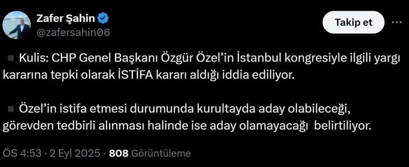 Şahin, yaptığı paylaşımda, "Kulis: CHP Genel Başkanı Özgür Özel'in İstanbul kongresiyle ilgili yargı kararına tepki olarak İSTİFA kararı aldığı iddia ediliyor. Özel'in istifa etmesi durumunda kurultayda aday olabileceği, görevden tedbirli alınması halinde ise aday olamayacağı belirtiliyor." ifadelerini kullandı.