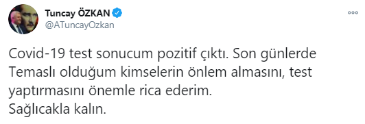 "Covid-19 test sonucum pozitif çıktı. Son günlerde Temaslı olduğum kimselerin önlem almasını, test yaptırmasını önemle rica ederim. Sağlıcakla kalın."