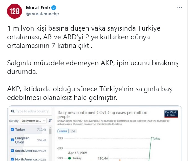 CHP Ankara Milletvekili Dr. Murat Emir, Our World in Data'dan edindiğini iddia ettiği bilgilerle vatandaşlara koronavirüs korkusu pompaladı.