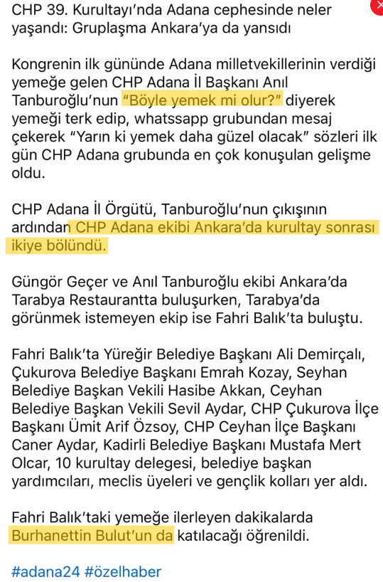 CHP Adana İl Başkanı Anıl Tanburoğlu’nun, “Böyle yemek mi olur?” diyerek vekillerin yemeğini terk ettiği, kendi ekibini Tarabya Restaurant’a topladığı öğrenildi.