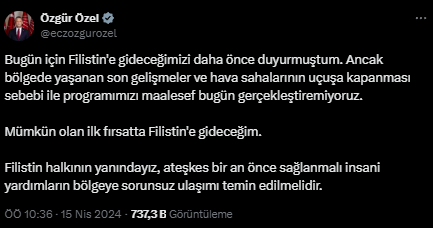 Özel; “Bugün için Filistin'e gideceğimizi daha önce duyurmuştum. Ancak bölgede yaşanan son gelişmeler ve hava sahalarının uçuşa kapanması sebebi ile programımızı maalesef bugün gerçekleştiremiyoruz. Mümkün olan ilk fırsatta Filistin'e gideceğim. “demişti.