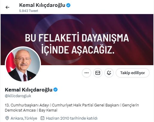 Kılıçdaroğlu'nun Twitter profilinde, "13. Cumhurbaşkanı Adayı | Cumhuriyet Halk Partisi Genel Başkanı | Gençlerin Demokrat Amcası | Bay Kemal" ifadeleri yer aldı.