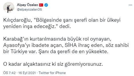 AK Parti İzmir Milletvekili Alpay Özalan, Kılıçdaroğlu'nun AK Parti'yi hedef alan sözlerine tepki göstererek sosyal medya hesabından bir paylaşımda bulundu.